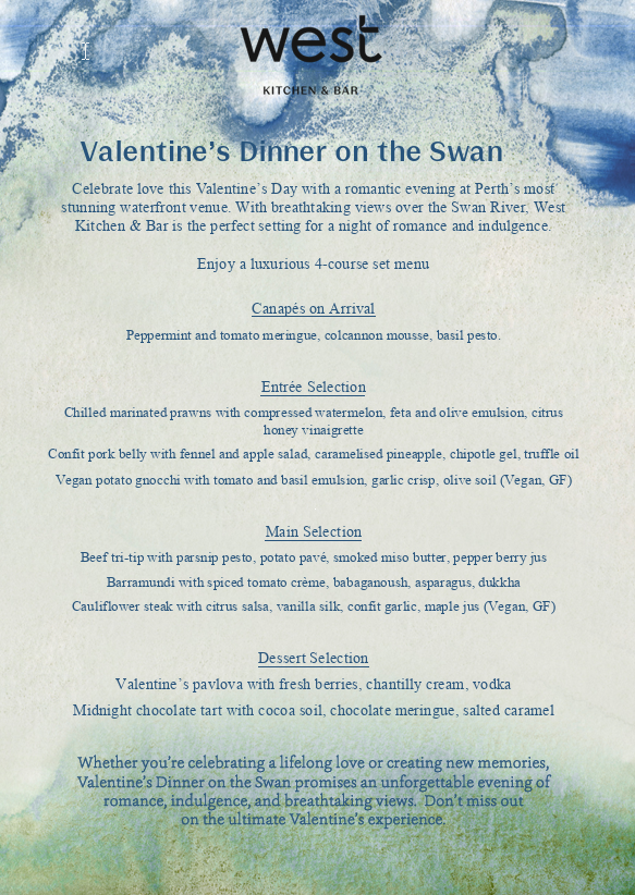 Celebrate Valentine’s Day at West Kitchen and Bar, located inside the Wonil Hotel Perth, with an elegant evening designed for sharing, savouring, and slowing down together.